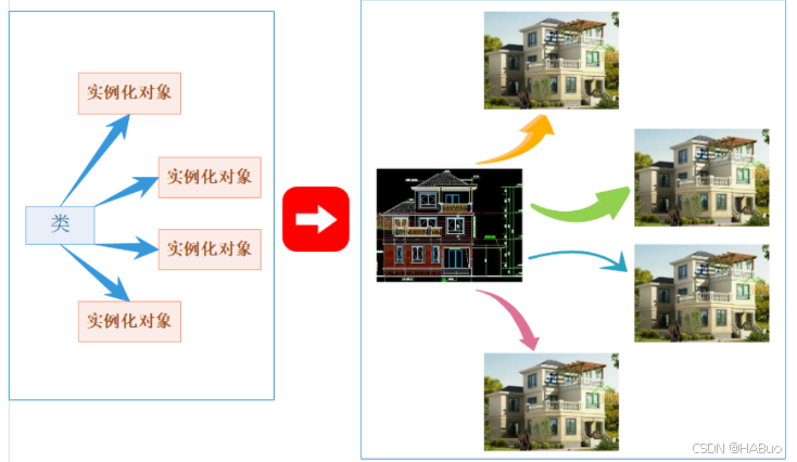 事实上类就像是一个盖房子的图纸,空谈,实例化就是在图纸的基础上盖房子。如下所示: