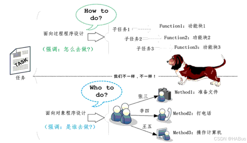 面向对象强调的是不同对象完成不同的任务,对象与对象之间相互交互完成最终的任务。再如洗衣服这个例子而言如下: 总共有四个对象:人、衣服、洗衣粉、洗衣机 整个洗衣服的过程: 人将衣服放进洗衣机、倒入洗衣粉,启动洗衣机,洗衣机就会完 成洗衣过程并且甩干 整个过程主要是:人、衣服、洗衣粉、洗衣机四个对象之间交互完成的,人不需要关 新洗衣机具体是如何洗衣服的,是如何用干的