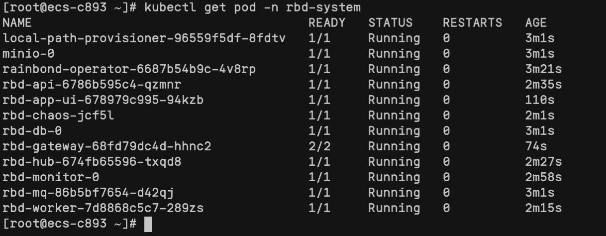 EOLhelm install rainbond ./rainbond-chart --create-namespace -n rbd-system -f values.yamlwatch kubectl get pod -n rbd-systemrbd-app-ui 的 Pod 为 Running 状态时即安装成功。如下所示,Pod rbd-app-ui-678979c995-94kzb 为 Running 状态时,表示 Rainbond 安装成功。