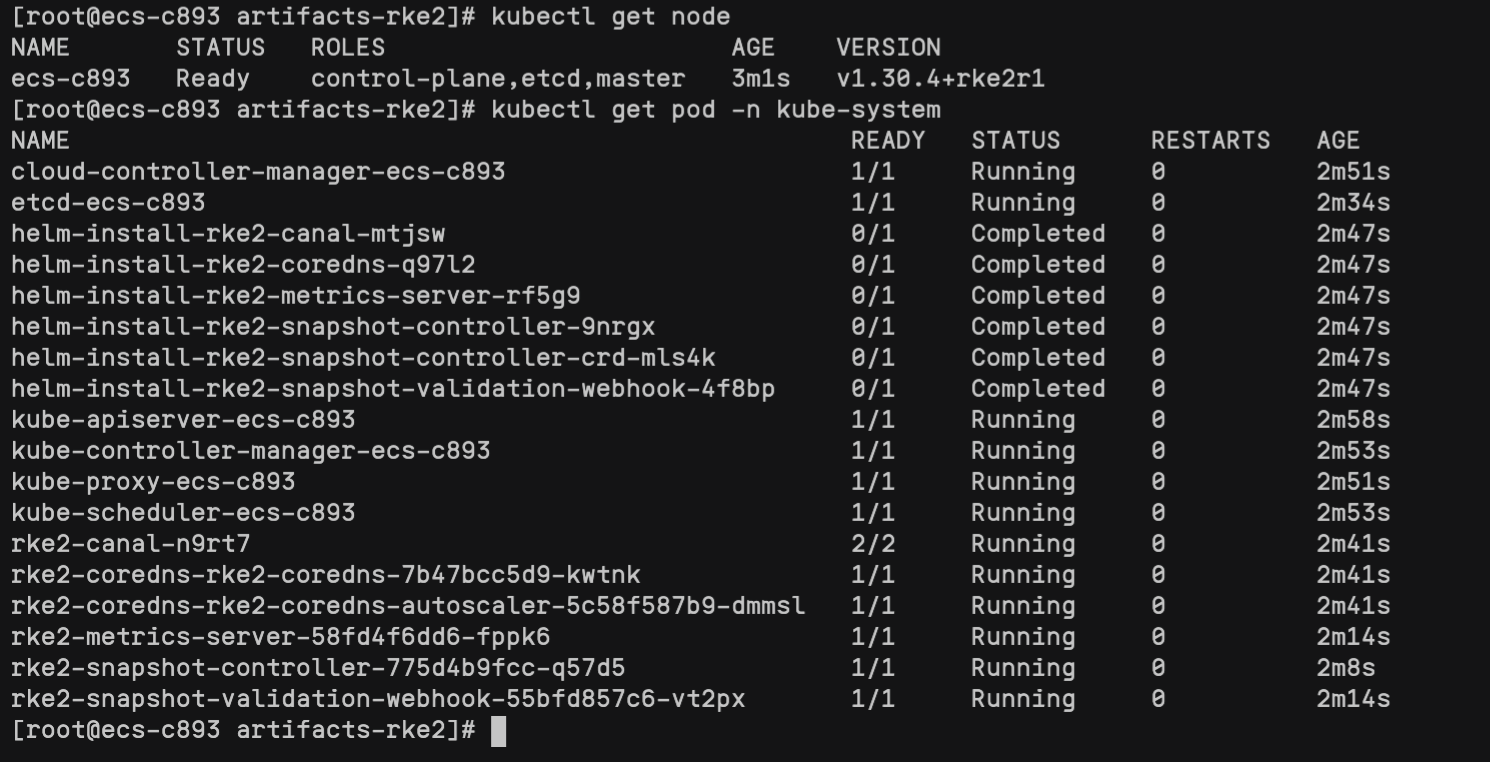 cd /root/artifacts-rke2INSTALL_RKE2_ARTIFACT_PATH=/root/artifacts-rke2 sh install.shsystemctl enable rke2-server.service && systemctl start --no-block rke2-server.servicejournalctl -fu rke2-servermkdir /root/.kube