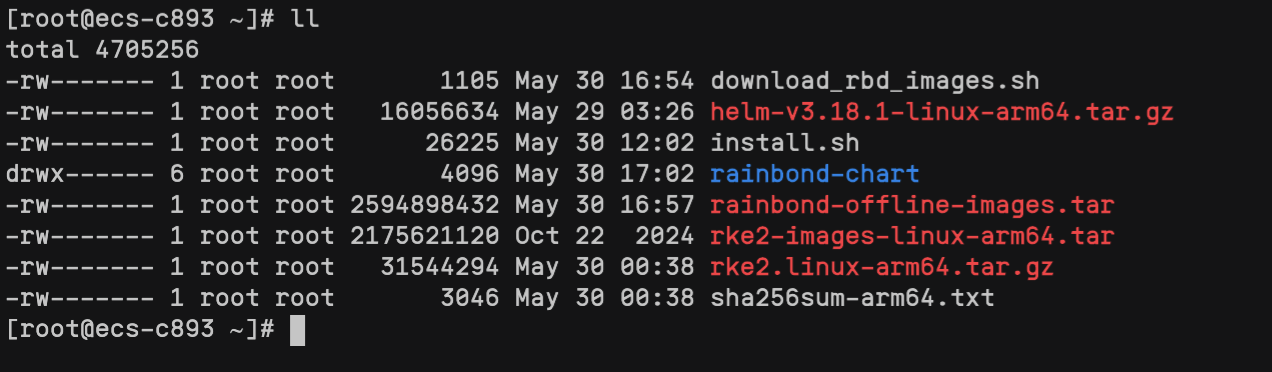 cp /root/rainbond-offline-images.tar /var/lib/rancher/rke2/agent/imagesmkdir /root/artifacts-rke2rke2、rke2-images、sha256sum 移动到一个目录中,如下所示:mv install.sh rke2* sha256sum* /root/artifacts-rke2