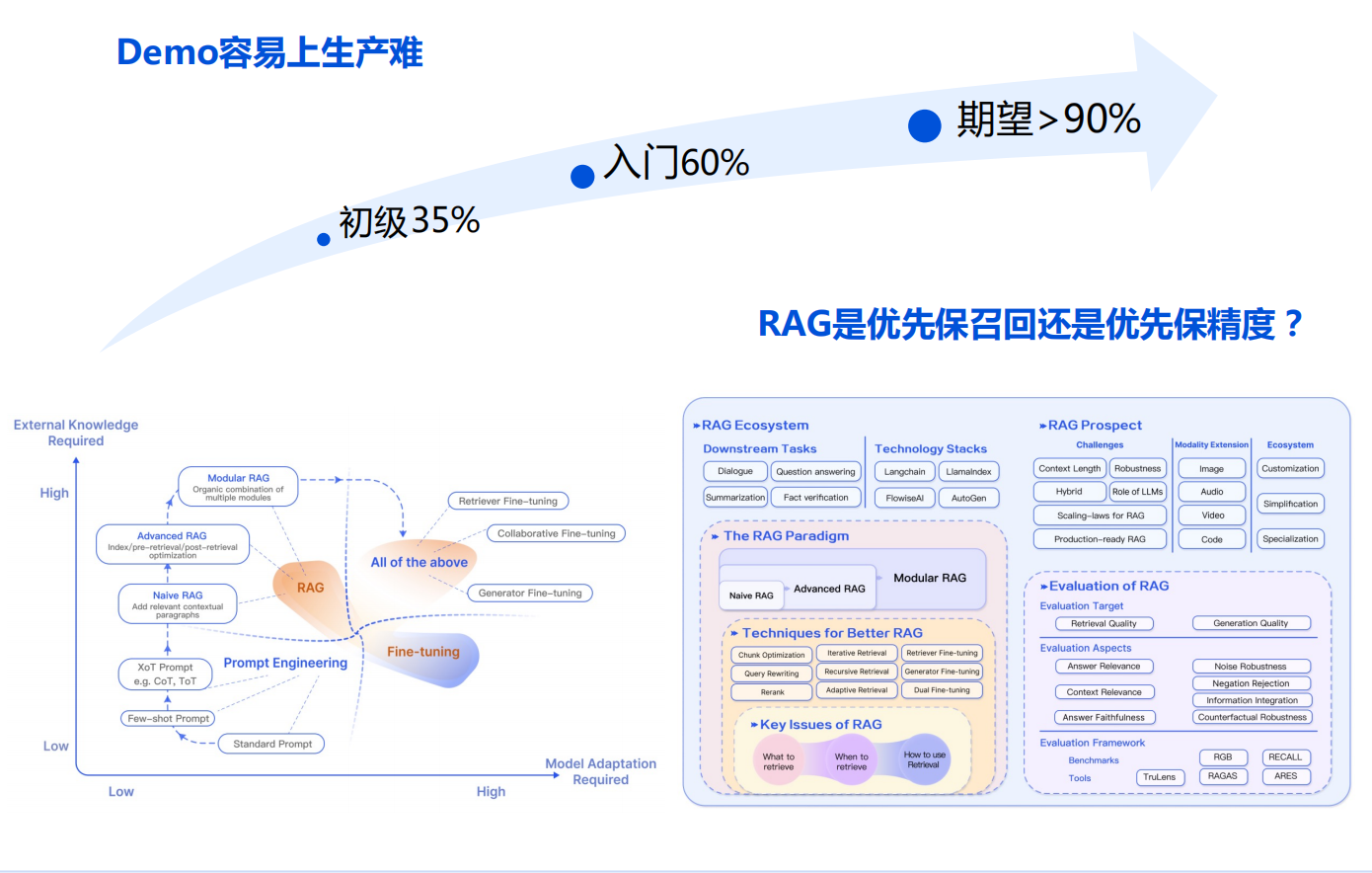 demo易,但上手难的主要原因是因为像LangChain和 LLamIndex这种框架盛行。很快接入就是初级的一个状态,可能只能做到35%。如提高整体一个准确率,可通过在拆分那儿会拆更合理、提取内容时,把整个内容提取更好。做向量化时,去选择我们的向量,更好的一个embedding模型。在最终我们去跟LLM交流时,选择效果更好的LLM,然后把这个效果给提升到更高。但实际上60%的一个准确率还是达不到我们生产环境落地的一个期望值。希望准确率90%,在RAG应用构建的各个阶段,我们都会有很多工程化的一些手段实现。