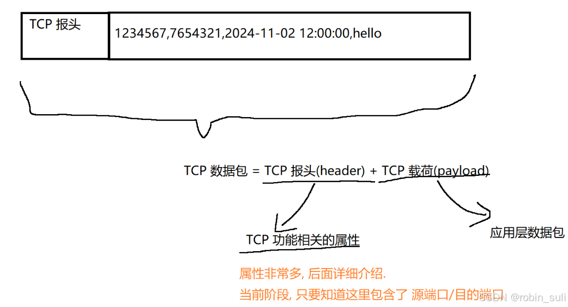 第二步传输层: 应用程序调用传输层提供的API,把数据传输给传输层,传输层拿到数据后,构造传输层数据报,传输层主要协议TCP/UDP 注:数据报一般等于,报头+载荷 报头:该数据包的一些属性,比如TCP的端口,窗口大小等等。 载荷:拼接上的,一层的数据包