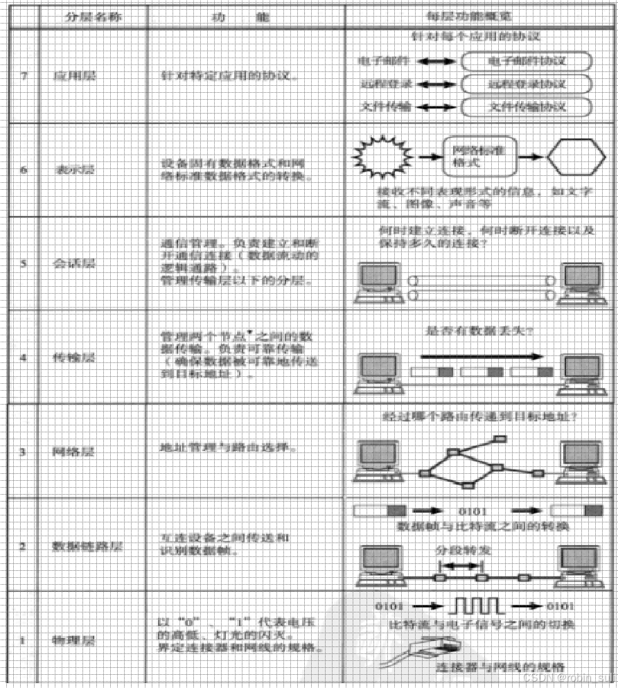 6. OSI七层模型: OSI 七层⽹络模型是⼀个逻辑上的定义和规范:把⽹络从逻辑上分为了7层。 OSI 七层模型是⼀种框架性的设计方法,其最主要的功能使就是帮助不同类型的主机实现数据传输;