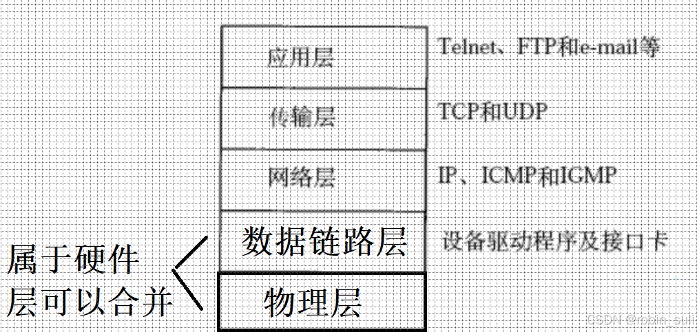 注:这里也可以把物理层和数据链路层看作一个整体,因为这两层都直接于硬件设备直接相关