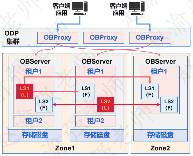 OceanBase数据库采用了多租户架构。多租户架构适用于资源整合、SaaS服务等场景,同时也降低了运维复杂度。OceanBase数据库采用了单集群多租户设计,天然支持云数据库架构,支持公有云、私有云、混合云等多种部署形式。OceanBase的多租户架构如下图所示: