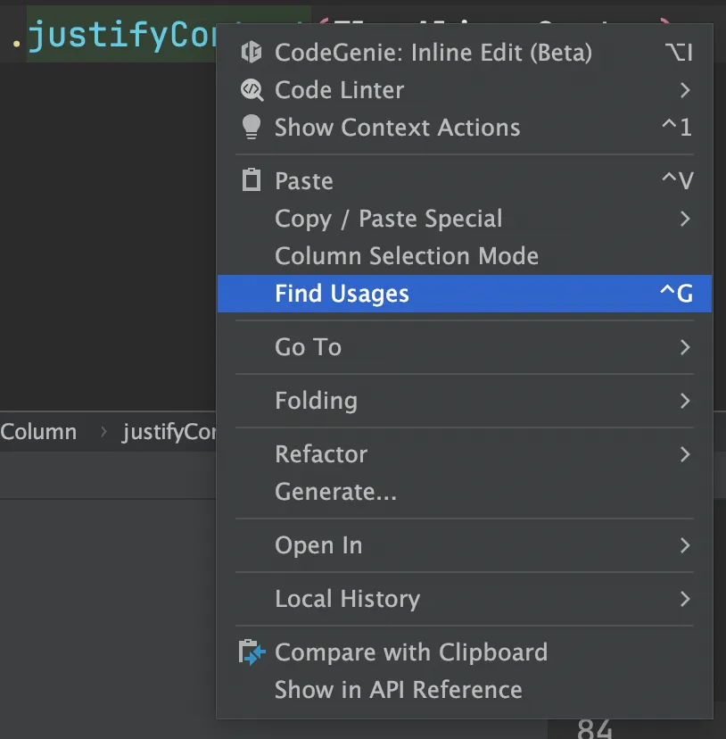 使用方式很简单,只需要把鼠标放置到你要检索的对象上,可以是一个对象,一个函数,一变量等等,点击右键,选择Find Usages,或者你也可以使用快捷键(由于系统不一样,IDE选择的快捷键语言不一样,那么快捷键也是不一样的,正常是WindowsAlt +F7,macOS为Option + F7)。