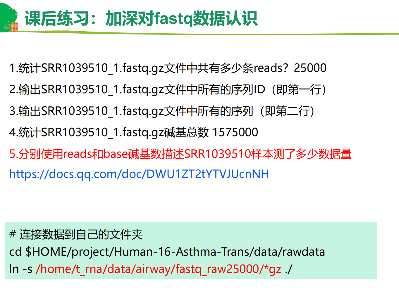 1、 zless -NS SRR1039510_1.fastq.gz | grep -c -E '^@SRR'