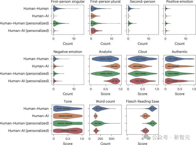 图3:不同实验条件下,大模型与人类对话的文本特征,包括易读性,情感真挚程度,涉及分析和逻辑的程度等