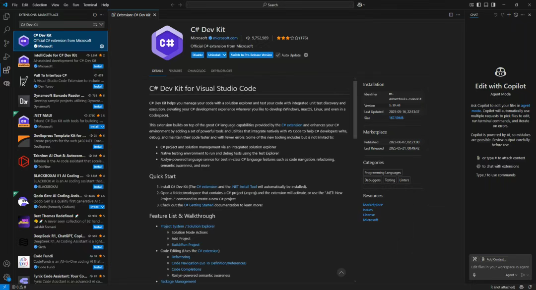 C# Dev Kit for Visual Studio Code(C# Dev Kit)是一个扩展工具,它为您的C#开发提供了一系列强大的功能和实用工具,以帮助您更高效地编写、调试和维护代码。它能够在Windows、macOS、Linux甚至Codespace等各种开发环境中使用,提升您的C#开发体验。