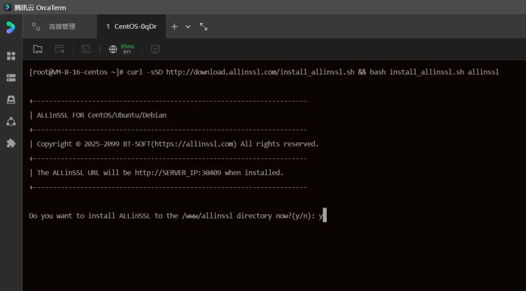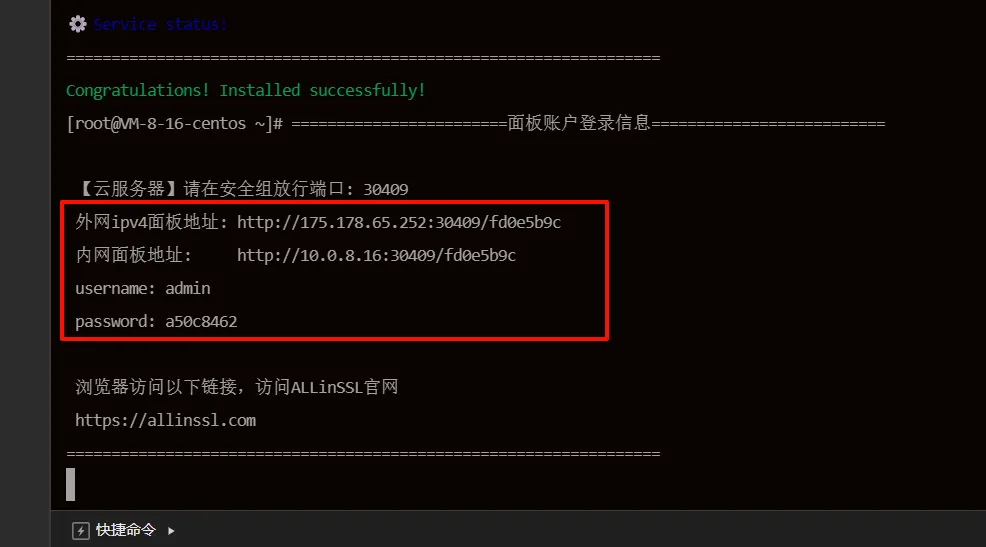 安装成功后,请务必记录ALLinSSL面板显示的访问地址、账号和密码。