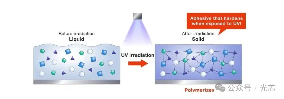 紫外光学胶粘剂是一种通过紫外辐照设备发出的紫外线(UV)能量在短时间内聚合固化的材料。