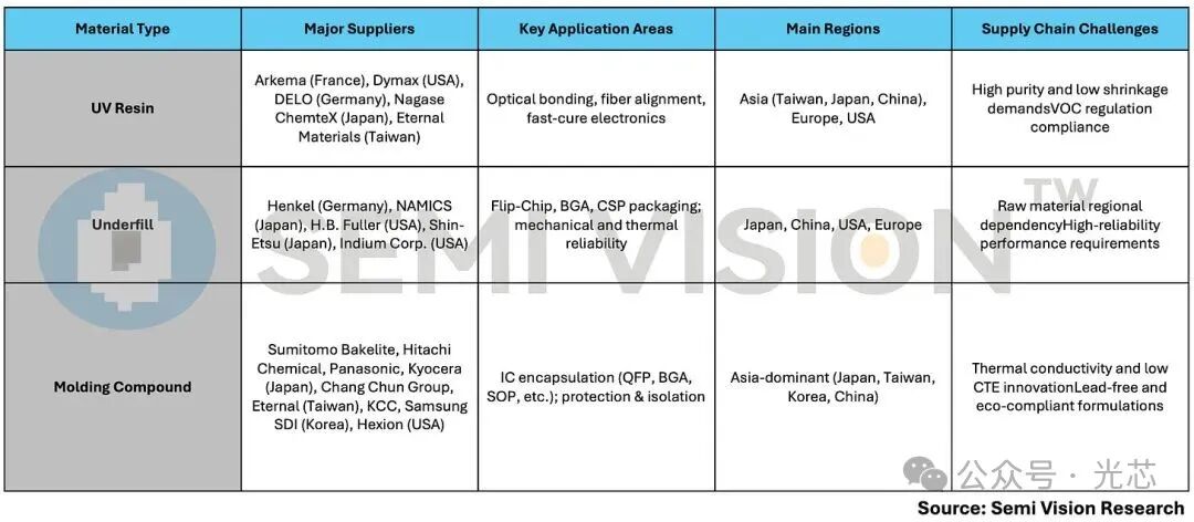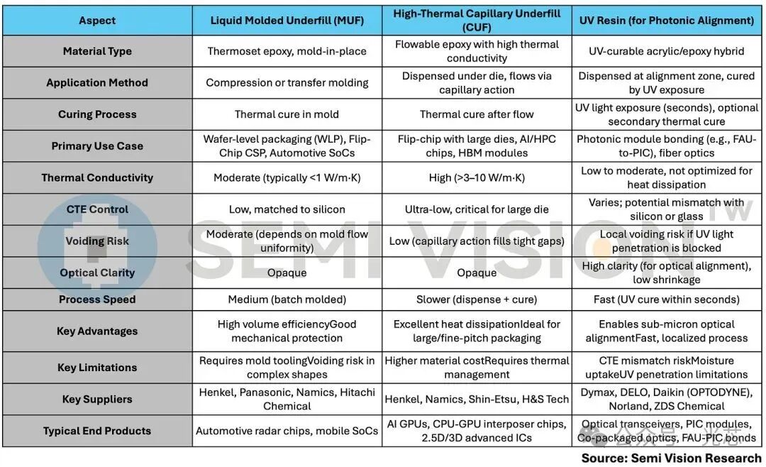 SemiVision近期更新了一篇关于共封装光学CPO材料的报告,聚焦于CPO封装和界面材料,重点阐述了紫外光学胶粘剂、液态模塑底部填充材料(MUF)、高导热毛细管底部填充材料(CUF)三大关键材料的性能特性、供应商格局及技术挑战。同时探讨了高温模量、耐化学性等核心评价指标,揭示全球供应链区域分工与创新趋势,指出材料创新是推动 CPO 规模化应用的关键基石。
