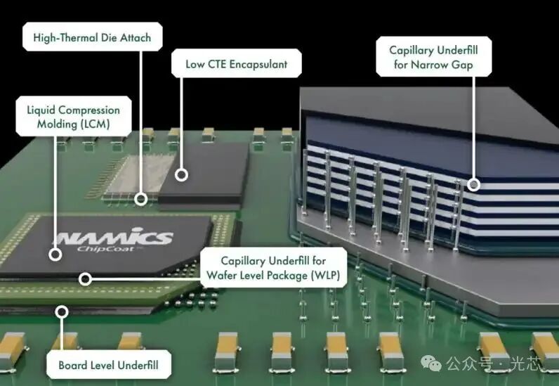 ④ Namics:Namics 提供全面的高性能倒装芯片底部填充材料,旨在提高先进半导体封装的可靠性和机械强度。这些底部填充材料旨在填充芯片和基板之间的间隙,提供热循环耐久性、应力消除以及防潮和防污染物保护。