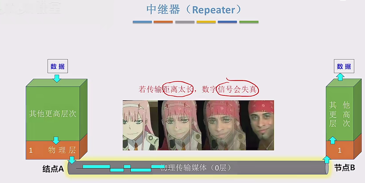 在这个视频中,我们要学习工作在物理层的两种网络设备,分别是中继器和集线器。首先来看中继器。在计算机网络中两个节点之间,需要通过物理传输媒体或者说物理传输介质进行连接。像同轴电缆、双绞线就是典型的传输介质,假设A节点要给B节点发送一些数据。这些数据经过各层协议逐层处理之后,最终在物理层这儿会把这些二进制数据转换成信号,然后发送到这个传输介质上。比如物理层可以采用曼彻斯特编码的规则,把二进制数据编成电信号,并发送到同轴电缆或者双绞线上进行传输。这些信号传输的距离越远,它就越有可能会失真。本来刚开始你传的是最左边的图,传着传着这个信号就变成最右边的图了,这就会导致信号的接收方可能无法准确的解析这些信号的含义。传输距离越长,信号失真越严重,这个应该不难理解。比如采用同轴电缆传输这种电信号的时候,同轴电缆本身就有电阻,只要它有电阻,就意味着当电压信号或者电流信号在同轴电缆上传输的时候,这些电压值和电流值肯定会受到电阻的影响,逐渐的失真,传输的距离越长,这种失真也会越严重。也正因如此,以太网技术中才会对这些传输介质提出一些标准规范。比如符合 10Base5 这种标准的同轴电缆,最远可以支持 500 米距离的传输。而10Base2这种标准的同轴电缆只能支持 200 米以内的这种信号传输。总之,为了确保在传输过程中信号失真别太严重。我们需要限制传输介质的长度。在这些条件的限制之下,如果我们想要让网络的覆盖距离更长,怎么办呢?