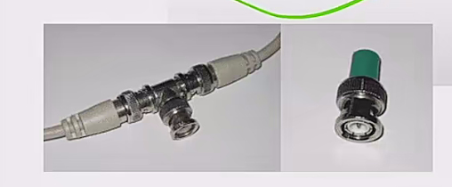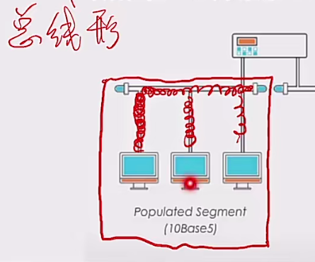而一根同轴电缆上可以通过这样的接口把它分接到多台计算机上。回到5-4-3原则,可以看到中间的这两个网段,我们是不允许挂计算机的。像这种一根同轴电缆连了多台计算机的,这种连接方式就是很典型的总线型网络。还记得我们第一章学过网络的拓扑结构吗?