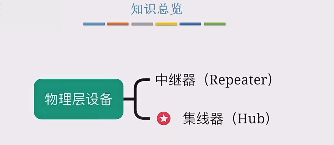 这个视频中我们介绍了物理层设备,分别是中继器和集线器。中继器只有两个端口,它会把一个端口接收到的信号整型、再生之后转发到另一个端口。集线器的原理和中继器类似,只不过它属于多端口的中继器,会把一个端口接收到的信号整形,再生之后转发到其他所有的端口。无论是中继器还是集线器,同一时间内只可以有一个与之相连的端口正在发送数据。如果有多个端口同时发送数据,就会导致信号冲突。我们介绍了一个很重要的概念,叫做冲突域,由中继器和集线器连接的各台主机,属于同一个冲突域。也就是说,这些主机同时发送信号的时候,会发生信号冲突,那为了解决冲突的问题,我们就需要采取一些策略,让这些主机完成信道争用,具体怎么实现信道征用我们会在后续的章节进行探讨。 除了中继器和集线器的基本原理之外,我们也补充了一些边边角角的特性。首先,中继器和集线器不可以无线串联。五四三原则有个大致的印象就可以,不需要过度深究,那个不是重点,另外我们强调集线器连接的网络物理上是星型拓扑,而逻辑上属于总线型的拓扑。以及集线器连接的各个网段需要共享集线器的总带宽。