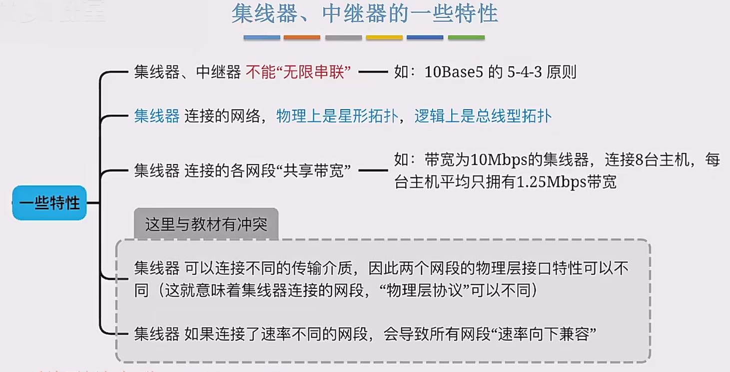 最后我们还补充了两个和国内教材,可能会不太一样的特性。首先,集线器可以连接不同的传输介质,这就意味着它可以连接不同的物理层协议。另外,在现实生活中,集线器也可以连接速率不同的网段,只不过会导致速率向下兼容。在做题的时候,大家可以以教材描述的为准,就是说这两种设备不能连接不同的物理协议,也不能连接速率不同的网段。做题的时候,大家可以按照这个标准来,但与此同时,希望大家带着一些批判性去看待这个知识点。你要知道现实世界的真实情况和书本里说的并不一样。 以上就是这一小节的全部内容。