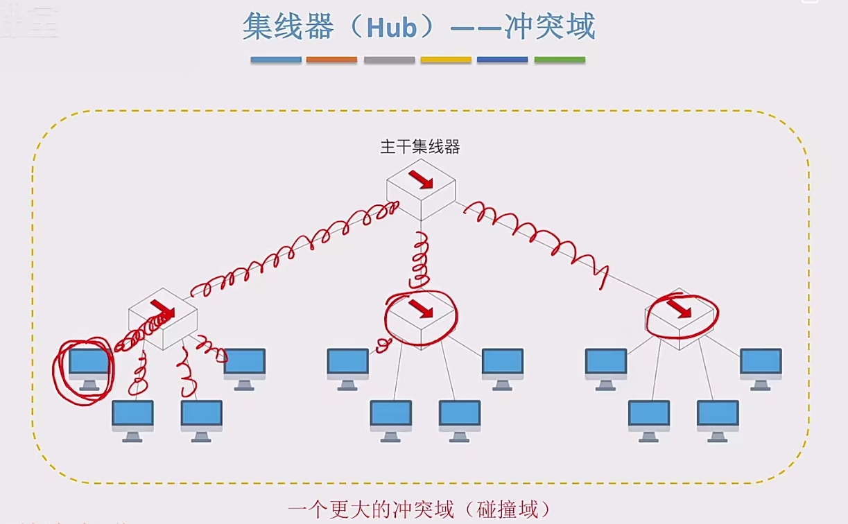 假设我们在这三台集线器之上,再连接一台更大的主干集线器。那此时原本三个独立的冲突域就合并为了一个更大的冲突域。比如现在最左边这台主机往集线器上发送信号。那么这个集线器会把信号首先是转发给与之直接相连的,另外三台主机。另一方面,他还会把这个信号转发给这个主干集线器,主干集线器收到这个信号之后,又会把它转发到右边这条线以及正下方这条线,而下面这两台集线器又会进一步的把这些信号进行转发。所以可以看到当左边这台主机发送信号的时候,它的信号会被转发到每一条线路上,此时如果有另一台主机也在发送信号。,那么这两台主机就发生了信号冲突,所以当我们用一个集线器连接了多个节点之后,所有的这些节点都会处于同一个冲突域。换句话表述,我们可以说集线器这种设备不能隔离冲突域。