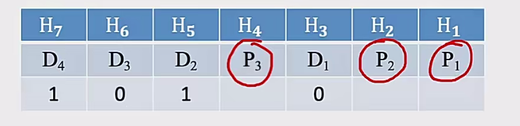 基于刚才的结论,如果说有四个信息位的话,那么我们可以确定我们要添加的校验位的数量k=3,也就说最终我们生成的海明校验码应该是四位再加三位,总共七位这么多。为了区分信息位和校验位,我们用D1到D4来表示这四个信息位,然后用P1到P3来表示这三个校验位,然后用H1到H7来分别对应最终的这七位海明码。那这些信息位和校验位应该放到什么位置呢?一个很容易想到的办法是把这三个校验位放到头部的位置,然后把四个信息位放到尾部的位置。但是海明码不能这么 做,它有一些特殊的规定。在海明校验码中,我们规定所有的这些校验位应该放在二的i-1次方这些位置上,也就是说P1、P2、P3这几个校验位,我们应该分别把它们放到一、二、四这几个位置,那如果还有一个校验位P4的话,显然应该放到八。有没有发现规律,其实和我们二进制的一个权值的上升关系是相符合的:一、二、四、八、十六。所以我们可以把这些校验位它所放的位置看作是这个校验位它所对应的某一种权值,那这个权值有什么用?我们一会儿再来解释。总之P1放到一的位置,P2放到二这个位置,P3 要放到四这个位置,剩下的这些位置我们再把它填入各个信息位。哪有空就填到哪,D1放到H3,D2、D3、D4。