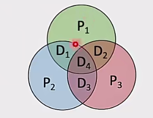 给大家一个图,你就能理解为什么能呈现出这样的规律了。这个图里边每一个圆圈表示的是从属于同一个分组的比特位。P1、D1、D2、D4从属于同一个分组,P2、D1、D4从属于第二个分组,P3、D2、D3、D4从属于第三个分组,而这三个分组相互之间是有交集的。所以来看一下,如果说D3这个信息位发生了跳变,由于第二个分组和第三个分组都包含了D3这个信息位。因此,D3的跳变会导致S2和S3算出来的结果都是1。而S1当中所有的这些信息位都没有跳变,因此它算出来的结果肯定是0。那么我们最终得到的S3到S1结果不就是110吗,也就是6,刚好就指向了D3所对应的位置。再看之前这个例子,我们是假定了P2发生了跳变,那么P2它只从属于第二个分组,因此它只会影响S2的值,而我们得到的结果101刚好又是指向了P所处的位置H2,再来一个例子,如果说是D4发生了跳变。那么你看一下D4它从属于所有的这些分组,因此所有的分组的偶校验,或者说这个异或运算的结果肯定都会被影响为1,而三个1对应的十进制不刚好就是七吗,同样也是指向了D4它所处的这个位置。这就是海明码的一个纠错原理,大家可以再结合这个图好好体会一下。
