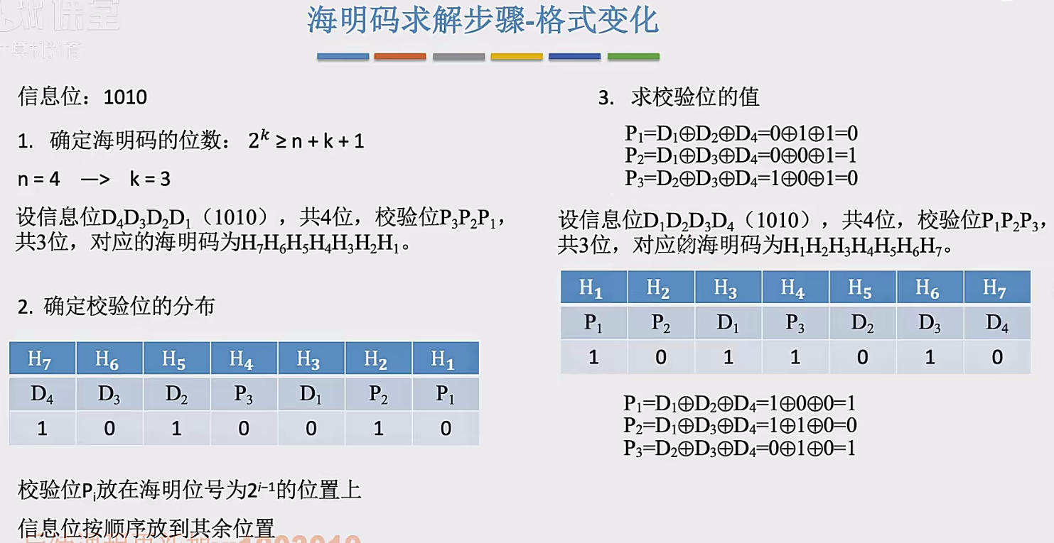 接下来第二个分组我们应该让它包含H3、H6和H7所对应的这几个信息位,也就是D1、D3和D4,把这几个信息位进行异或运算所得到的结果就应该是这个分组的偶校验位的一个值。最后一个分组的确定方法也是一样的,H5、H6和H7也就是D2、D3、D4,它们属于同一个分组,把它们异或可以得到偶校验位的值。所以对于第一个分组D1、D2、D4,也就是011分别进行异或。首先是D1和D2的异或是等于1,然后这个1再和D4进行异或是等于0,所以P1的值我们就确定了,应该是等于0。换个角度来说,就是这个分组当中信息位加上校验位,总共只有偶数个1。 接下来对于第二个和第三个分组的偶校验原理,其实也是类似的,就不再赘述,基础不好的同学可以暂停下来理解一下。到目前为止,我们已经确定了P1、P2、P3的值,应该分别是010,我们就确定了整个海明校验码的一个值,应该是这样的一个状态。接下来我们就可以利用这个海明码来进行检错和纠错,怎么检测出错误呢?其实就是把各个分组内的这些二进制比特位,进行一个异或运算,也就是对各个分组进行偶校验,如果说这个分组内没有出错的话,那么进行异或运算得到的结 果应该是零。