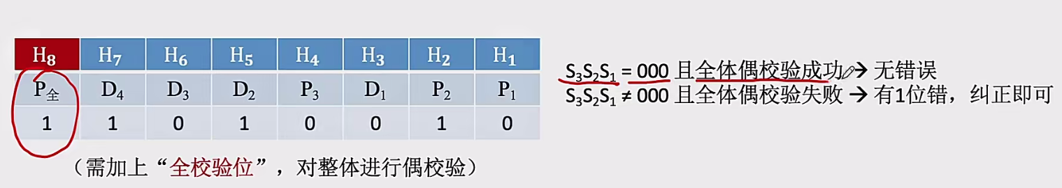 此时我们是发生了两个比特位的跳变,也就是说,基于之前提出的方案,我们是没有办法区分到底是一个比特位的错误,还是两个比特位的错误?所以为了解决这个问题,实际海明码在使用的时候通常还会在最首部加上一个全校验位。所谓全校验,就是对我们之前得到的这一整体全部的这些比特信息统一的进行一次偶校验,所以看一下之前这些例子当中总共有一个两个三个一,所以这个全校验位我们应该把它设为1,保证整体来看有偶数个1。添加了这个全校验位之后呃=,如果我们求得的S1到S3全部是0,并且全体的偶校验是成功的,那么就说明此时没有发生错误,而如果S1到 S3不等于0,并且全体的偶校验失败,说明有一位的错误,我们只需要把它纠正就可以,比如P1 发生了跳变,最终我们S1到S3应该是001,也就是指向了1这个位置,而由于只有P1这样一个位发生了跳变,就导致整体的偶校验是失败的。这个时候就说明H1这个位发生了错误,我们只需要把它从1改为0就可以,不需要要求发送方重新发送这个数据。再来看,如果说有两个位发生了错误,就像刚才那个例子一样P1、P2同时发生了错误,那么S1到S3得到的结果应该是零一一。但这种情况下,整体的偶校验是会成功的,所以此时就说明是发生了两个比特位的错误。由于我们没有办法确定这两个比特位错在哪,所以我们就需要要求对方重新传送这些数据。