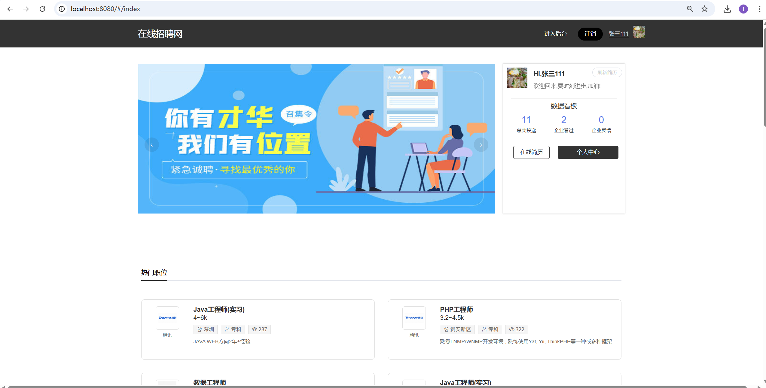 用户可以登录注册成功求职者。在首页里面可以浏览热门职位,还可以浏览热门公司,首页还展示了数据统计信息:总共投递量 ,企业看过量, 企业反馈量。