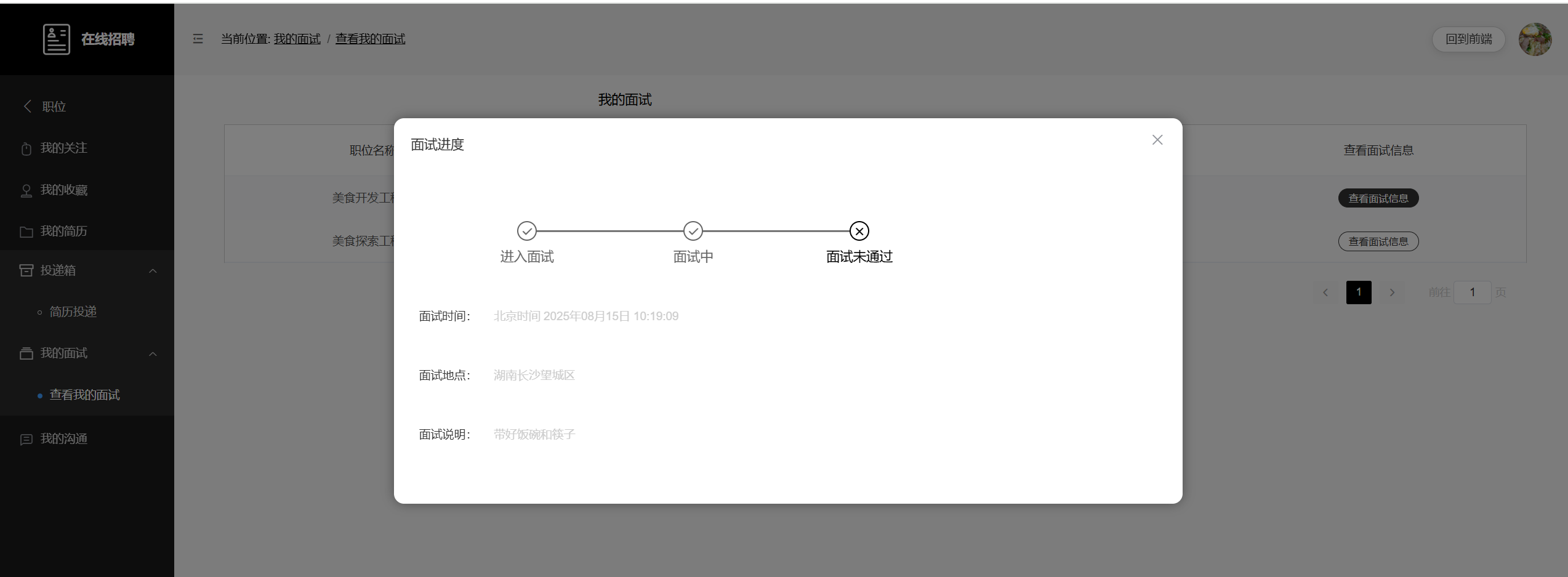 当招聘者对投递的简历发出面试申请时,求职者放可以收到我的面试,然后可以查看面试地点,时间等信息,如果招聘者对面试通过,面试数据的状态就会改成面试成功。