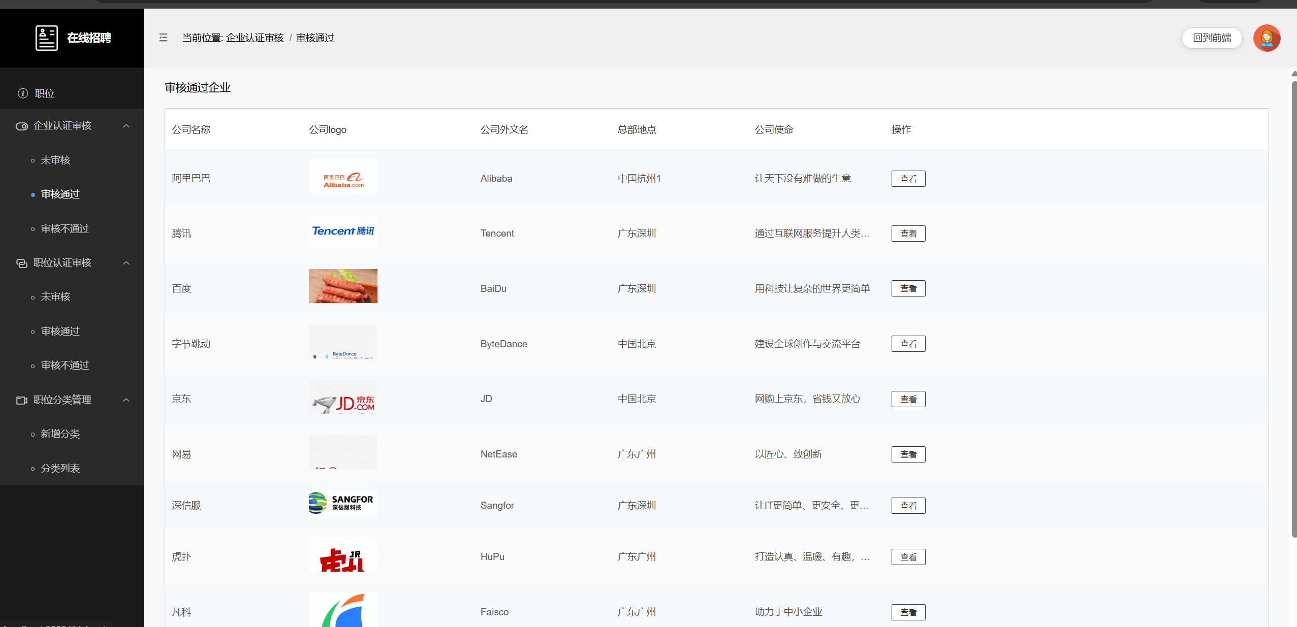 招聘者新注册账号后,都需要进行企业认证,才能发布职位。管理员可以查看申请的企业,然后对企业进行审核通过或者审核不通过。通过后,可以在 审核通过列表查看,拒绝后,可以在审核不通过列表中查看。
