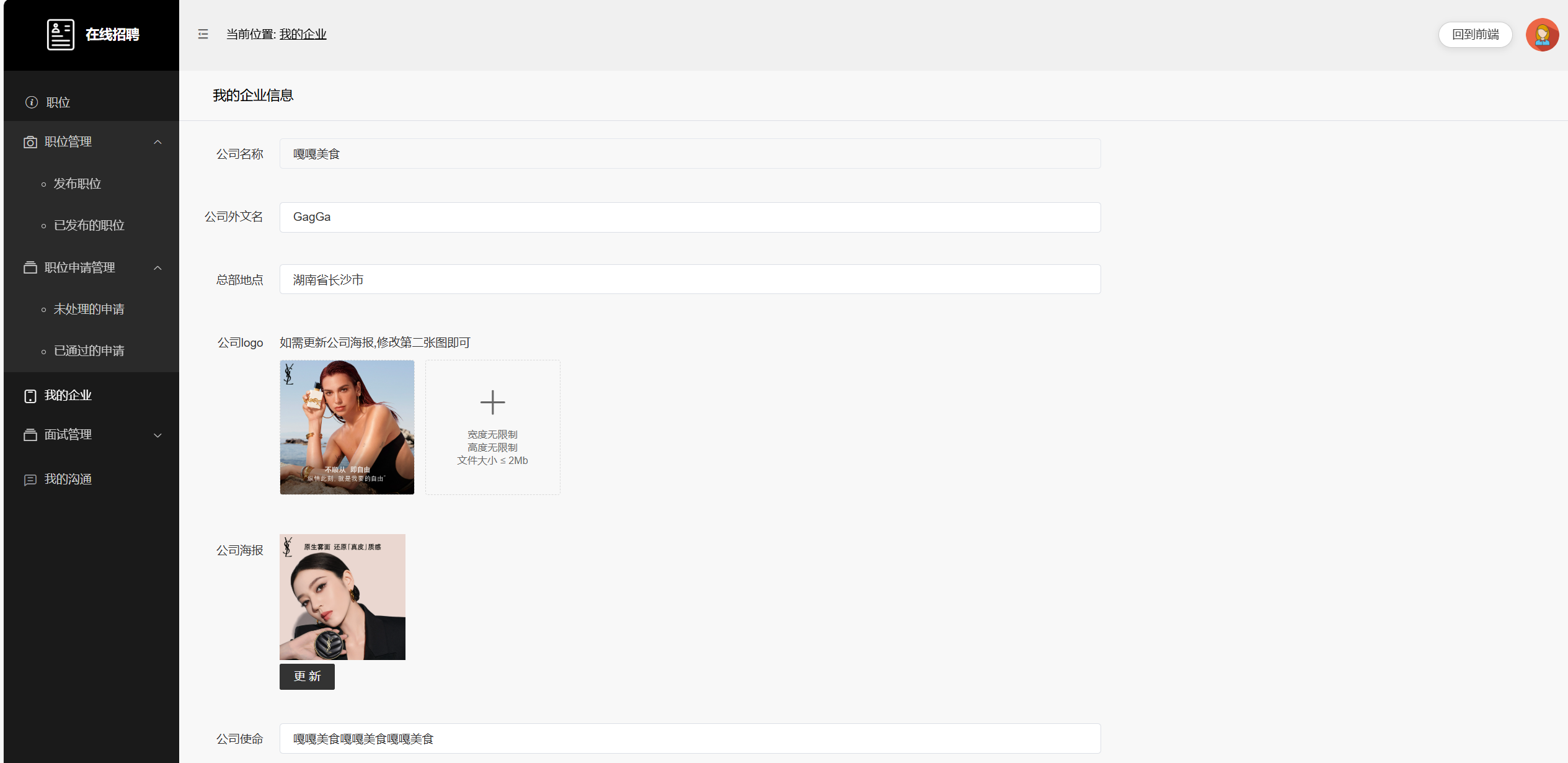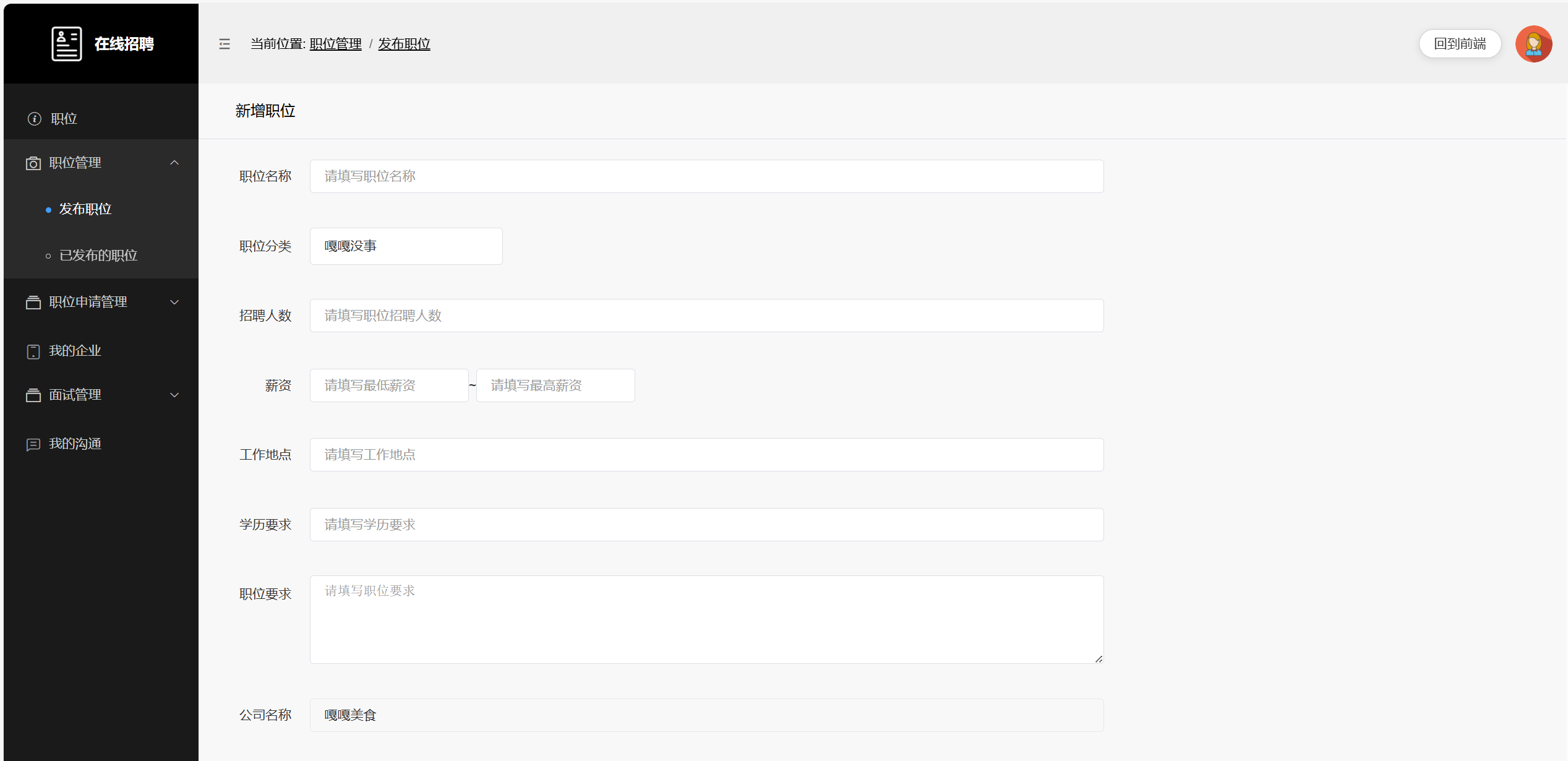 “工作地点”,“学历要求”,“公司名称”等信息,每个属性都是必填,发布职位后,也需要管理员进行审核。
