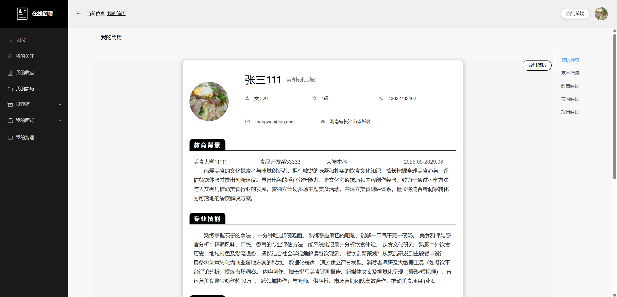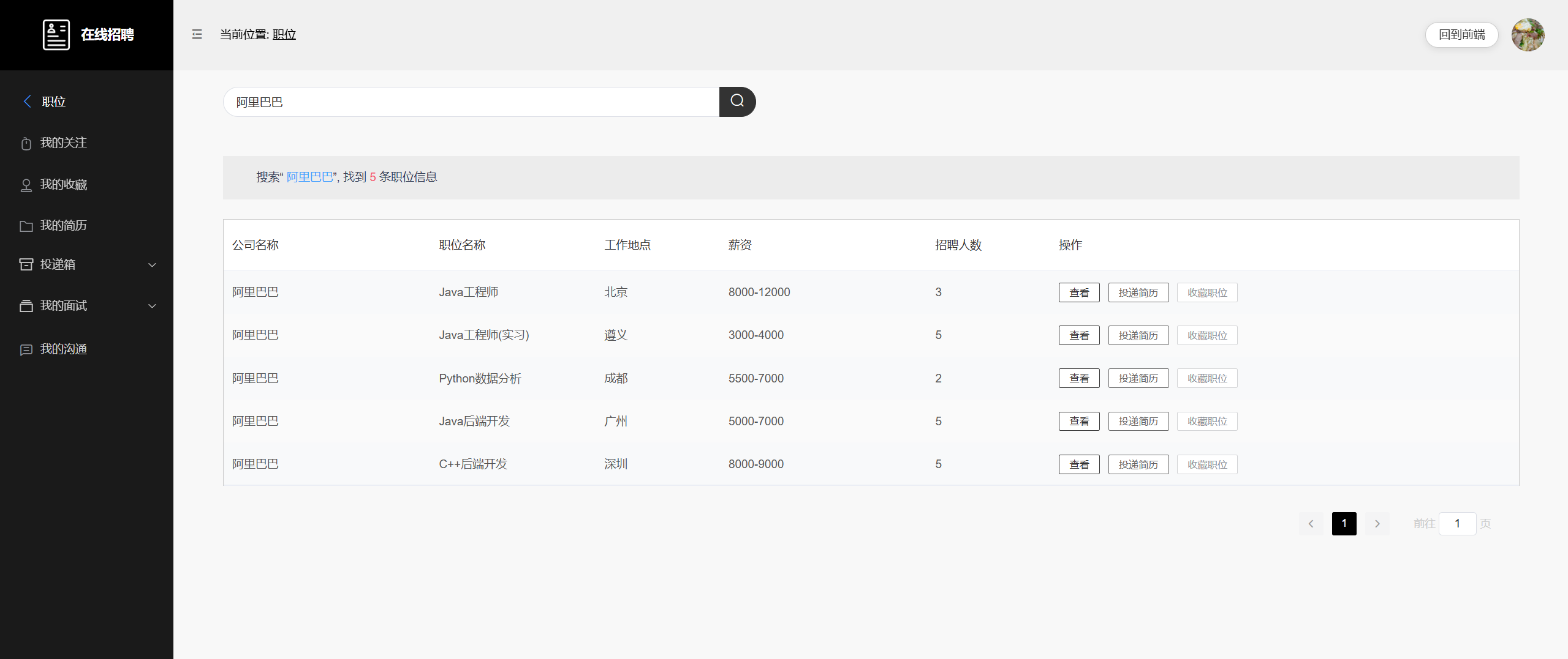 可以查询到求职者投递的简历职位,招聘者可以查看到求职者的简历, 还以进行通过和不通过操作,通过后,进行面试预约阶段。