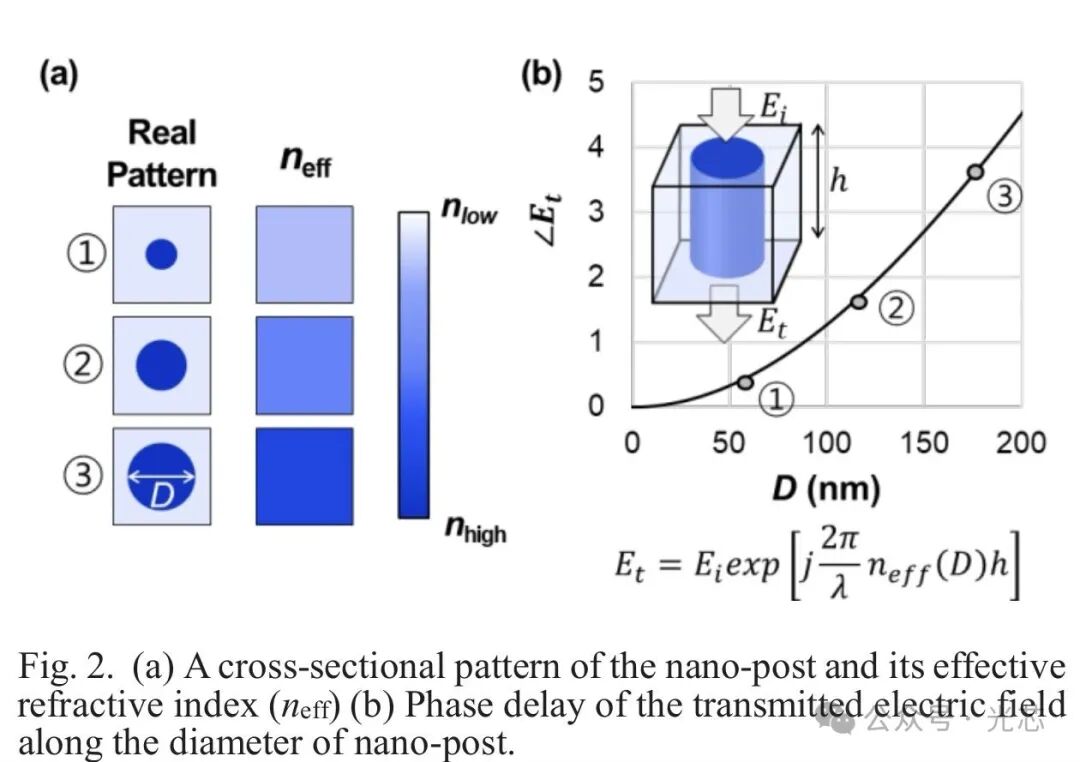 超表面由亚波长纳米柱阵列组成,通过改变纳米柱的宽度来调制透射光的局部相位[5]。如图2(a)所示,光传播的有效折射率(neff)由高折射率和低折射率组件的材料组成决定。如图2(b)所示,透射光的相位延迟与neff及其厚度成正比,通过控制高折射率材料的比例来调节。因此,通过选择MML的高折射率纳米柱的宽度,针对每个入射角和光波长进行优化,可以模拟非对称ML。