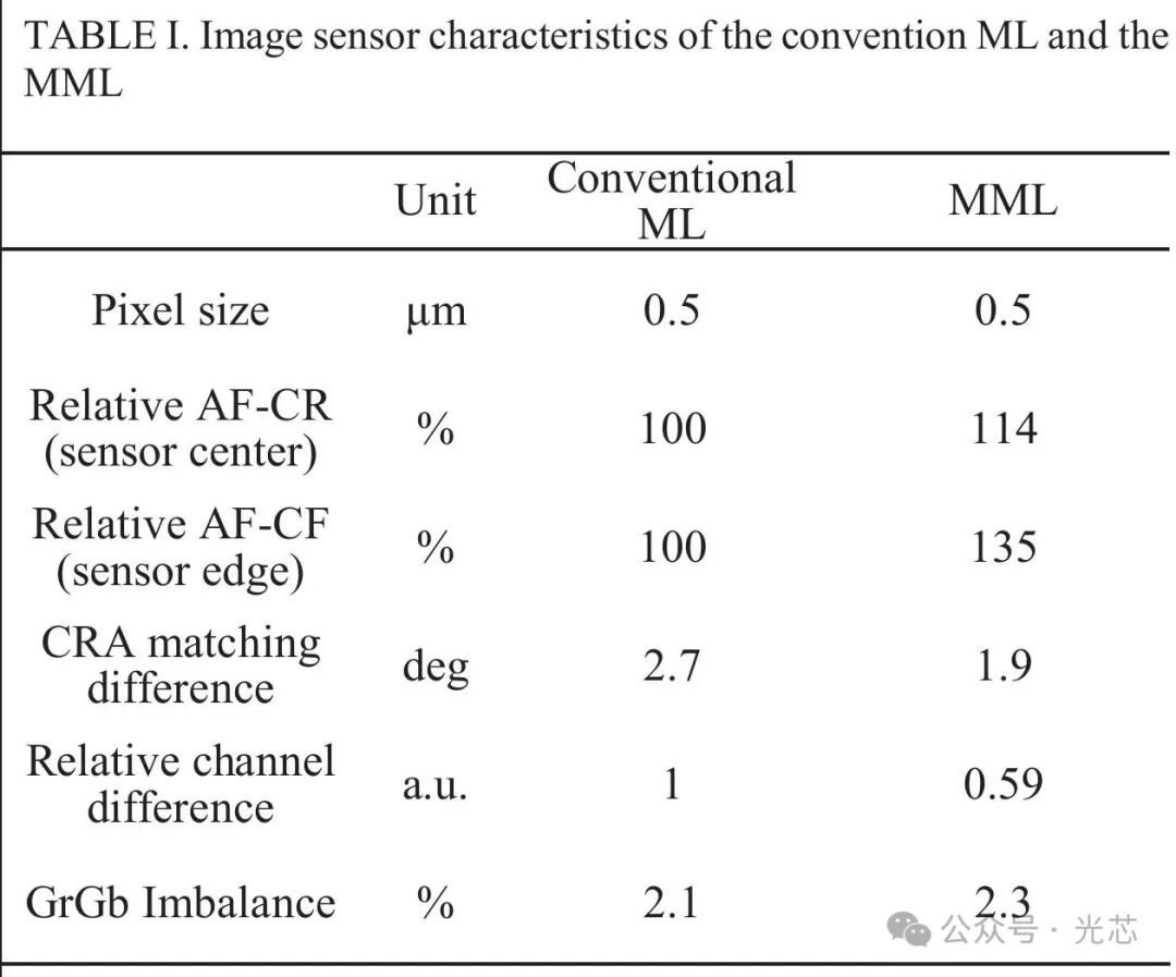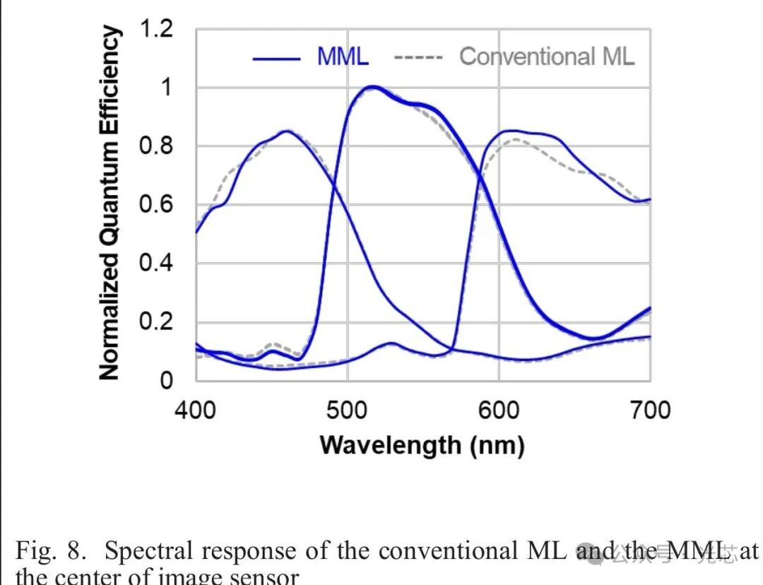 量子效率(QE)与波长的光谱响应如图8所示。在传感器中心,MML的QE与传统ML相当,红色像素略有增加,串扰无退化。另一方面,MML的GrGb失衡可能受到相邻MML的相邻纳米柱的影响,这些纳米柱分别针对红色和蓝色进行了优化。为减轻这种相互作用,MML的设计尽量减少绿色与蓝色/红色MML附近纳米柱的尺寸差异。结果,实现了2.3%的GrGb失衡,与传统ML情况的2.1%相当。表1总结了所提出的MML的特性。