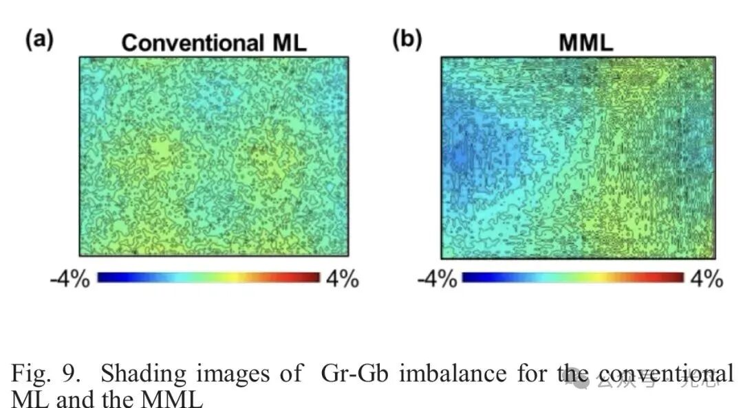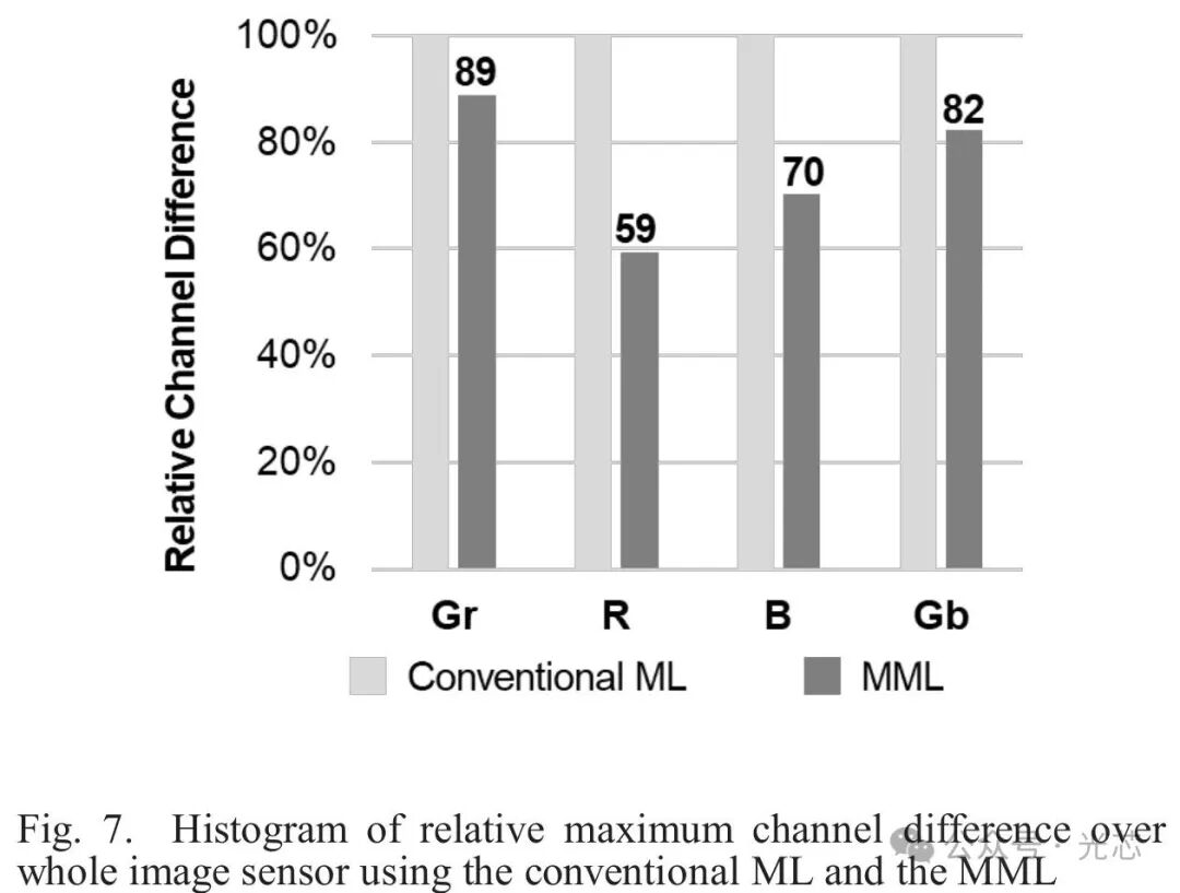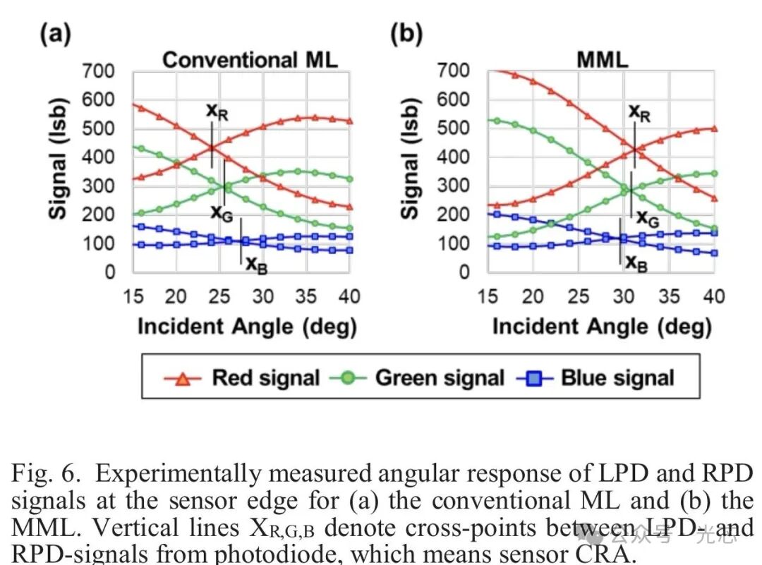 图6绘制了传感器边缘每个颜色的PDAF左光电二极管(LPD)和右光电二极管(RPD)的角度响应。LPD和RPD信号相等的交点XR,G,B可视为传感器的CRA,它们之间的颜色差异是由色差引起的CRA不匹配。在目标CRA为26度时,传统ML的XR,G,B差异为2.7度,而在目标CRA为31度时,MML的差异为1.9度(降低了30%),尽管更大的目标CRA通常会导致更大的CRA不匹配。这表明MML可以补偿由CRA不匹配引起的颜色差异,使其成为超广角相机应用的有力候选者。由于CRA不匹配补偿,图7中的直方图显示整个图像传感器上相对最大16通道差异,所有颜色的通道差异显著减少,Gr、R、B和Gb通道分别为-11%、-41%、-30%和-18%。