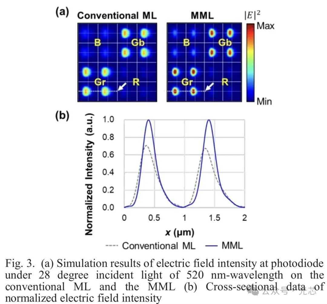 例如,图3(a)显示了使用严格耦合波分析(RCWA)模拟的0.5 μm tetra2(4×4)四单元图像传感器在520 nm波长光28°斜入射下,光电二极管表面的计算电场强度分布。为证明MML的像差校正,图3(b)显示了图3(a)中虚线的横截面。与传统ML情况相比,聚焦光束的半高宽(FWHM)减少了约24%。