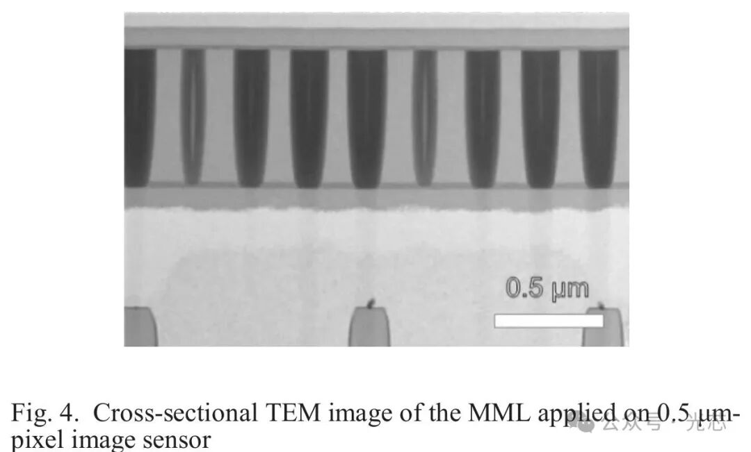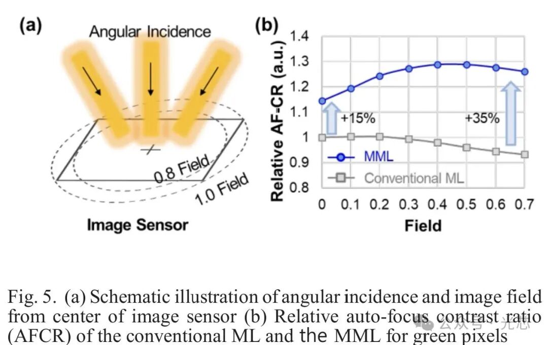 图4显示了所实现的MML的横截面透射电子显微镜(TEM)图像,二氧化钛纳米柱填充在氧化物包层中。如图5(a)所示,沿图像传感器的视场测量角度响应。由于MML根据CRA的自适应设计,自动对焦对比度(AFCR,散焦下左右信号之比)在整个图像传感器上得到改善。图5(b)中MML的归一化AFCR显示,与传统ML相比,在图像传感器中心提升15%,在边缘提升35%。