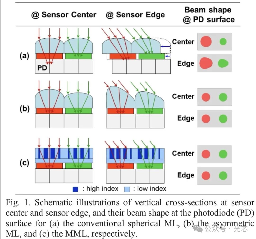 对不同颜色使用相同的球形ML阵列,会因色差在大角度入射光下加剧通道差异。ML的这两种像差成为实现更高分辨率图像传感器像素缩放的主要障碍。为解决这一问题,如图1(b)所示的用于像差校正的非对称ML可能是一个有前途的候选方案。然而,为大规模生产单独优化每个曲率的制造难度很大。