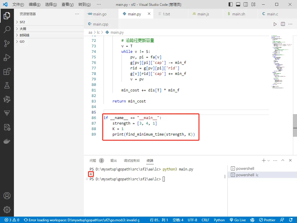 strength 数组的所有排列,表示解锁的顺序。t=0,能量 e=0,速率 X=1。e ≥ strength[i]:t,能量为 e,速率为 X。e + X * dt ≥ strength[i],其中 dt 是等待时间。dt ≥ ceil((strength[i] - e) / X),如果 e ≥ strength[i],则 dt=0。t += dt + 1(dt 是等待时间,+1 是解锁操作的时间)。e=0,X += K。代码使用了最小费用最大流(MCMF)来解决这个问题: