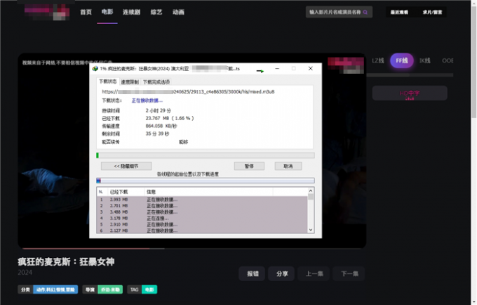 3、在弹出的下载信息窗口中,复制URL一栏中的M3U8地址,这就是视频的真实播放地址。