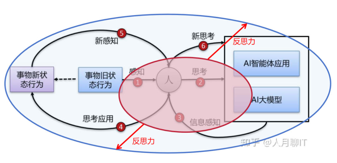 注意在这个图中,增加了4,5,6的新思考和新实践。同时通过外层循环推动了外在世界,外在事物的新发展,新行为,并通过了社会,文明,科技的进步。在这个外在循环中,这些新思考点是需要深度思考的,是需要在感知到新事物后人主动去思考和转化的,这个AI暂时没有这个能力做这个事情。是人类通过新思考,形成新的知识和经验,然后再作为语料库投喂给AI。让AI具备了给第一类人提供新知识的能力。