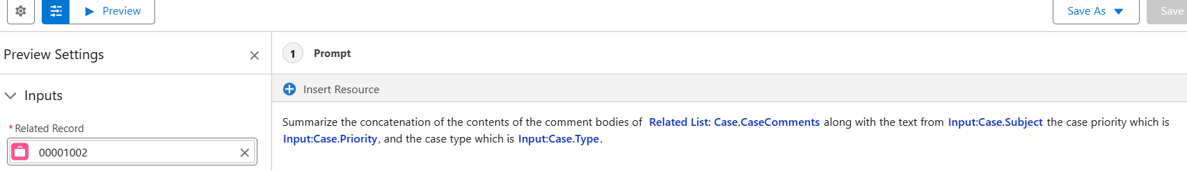 7.Paste the following text into the Prompt Template Workspace. Summarize the concatenation of the contents of the comment bodies of COMMENTS along with the text from SUBJECT, the case priority which is PRIORITY, and the case type which is TYPE. Keep the response to a single short paragraph.8.