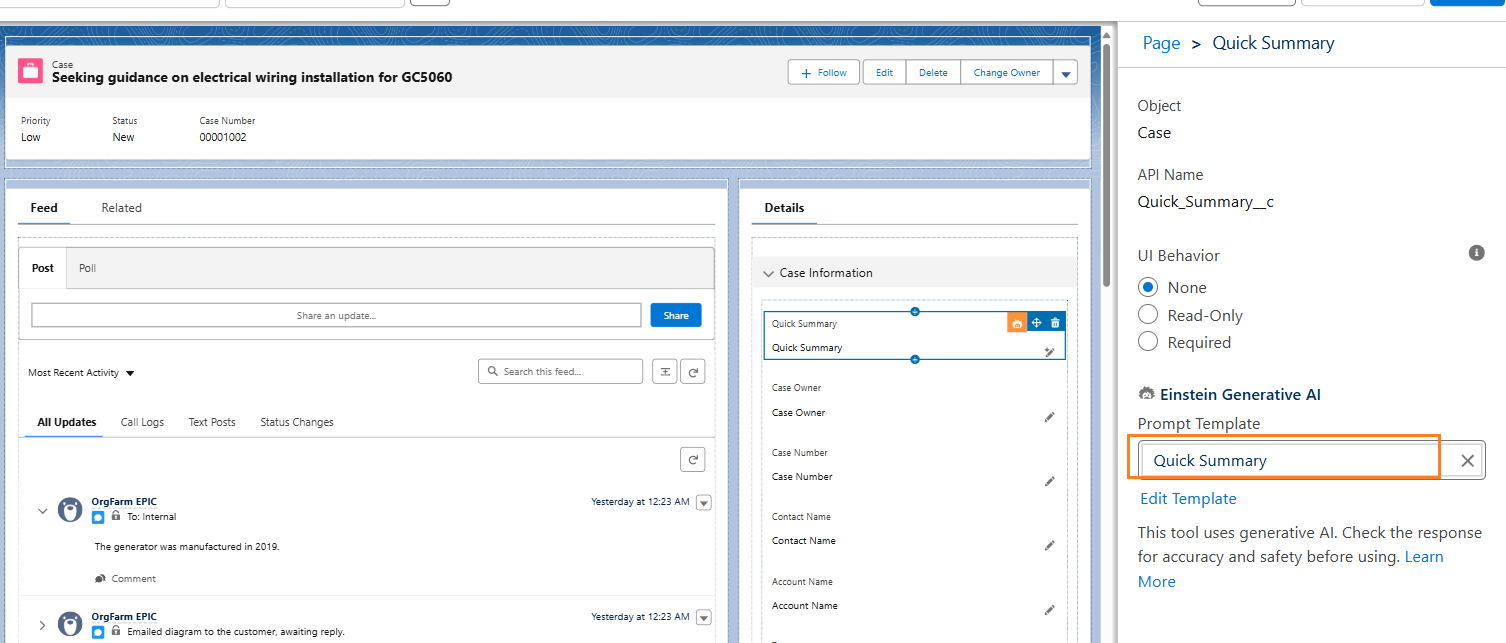 3. In the Quick Find box, enter Prompt, then click Prompt Builder. 4. Click New Prompt Template.select Field Generation. 5..For Prompt Template Name, enter Quick Summary. For Template Description, enter A short summary of case details. For Object, find and select Case. For Object Field, find and select Quick Summary. 6. Click Next.