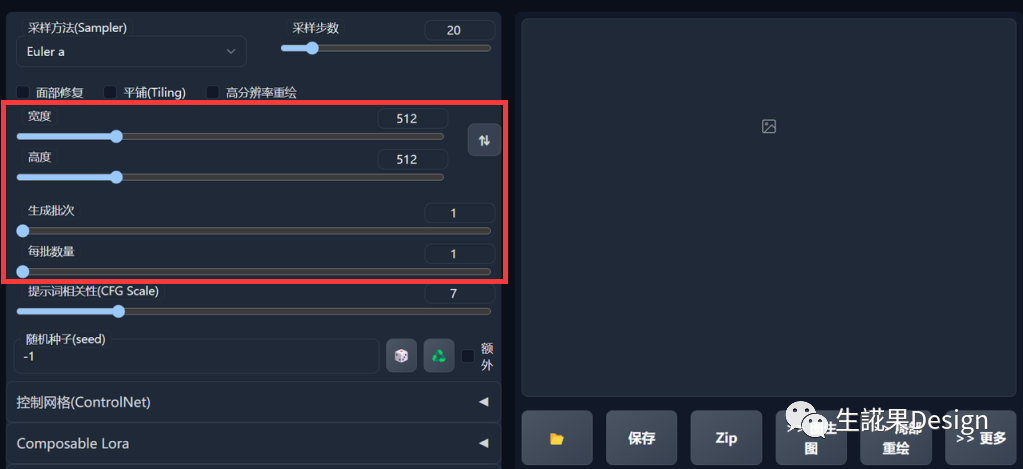 生成批次:每次生成图像的组数。一次运行生成图像的数量为生成批次 * 每批数量。
