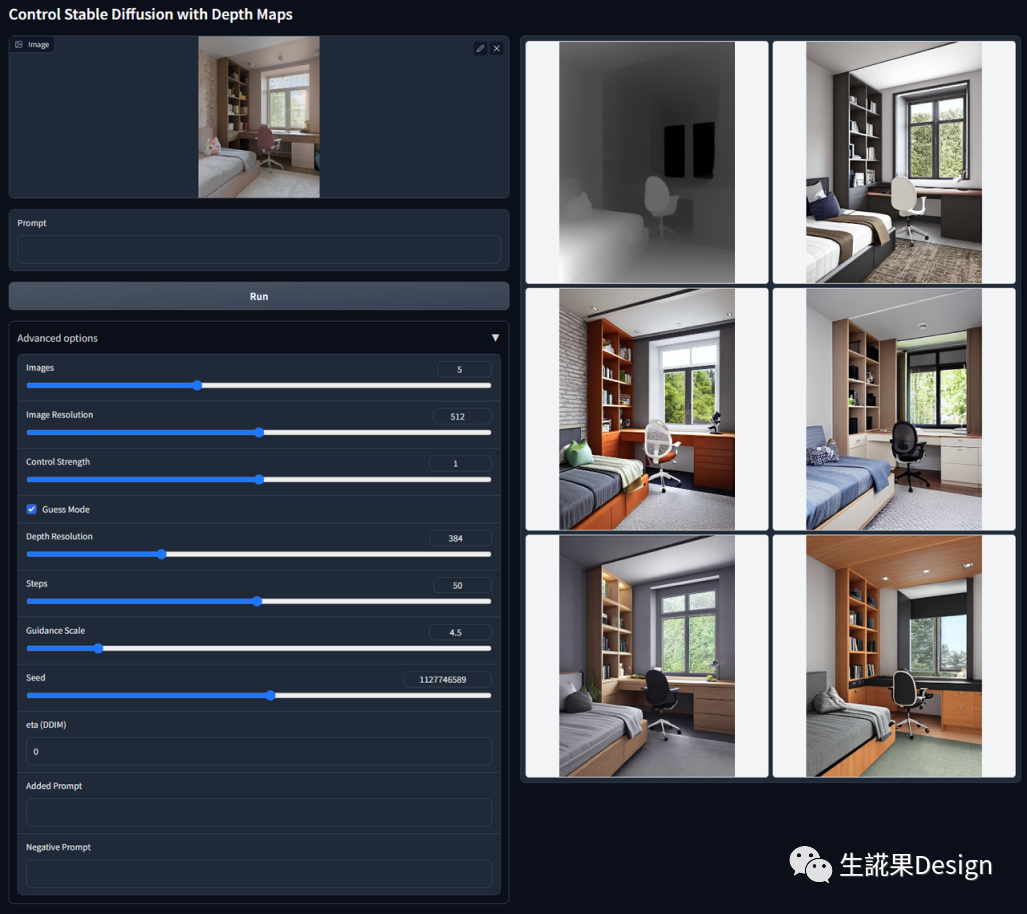 推测模式:ControlNet自动识别图像(不需要提示和负面提示)与选定的预处理器。它强制 ControlNet 编码器遵循输入控制图(如深度、边缘等),即使没有提示也是如此。使用此模式时使用更高的步进,例如50,但是这个效果不一定好。