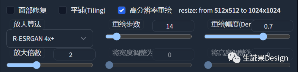 高分辨率重绘:使用两个步骤的过程进行生成,以较小的分辨率创建图像,然后在不改变构图的情况下改进其中的细节,选中该选项会有一系列新的参数,