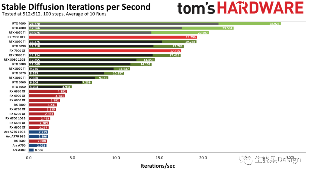 从图中可看出,与AMD或英特尔的任何产品相比,Nvidia的GPU提供了卓越的性能–有时是以巨大的优势。随着Torch的DLL修复到位,RTX 4090的性能比带有xformers的RTX 3090 Ti高出50%,而没有xformers的性能则高出43%。生成每张图片只需要三秒多。