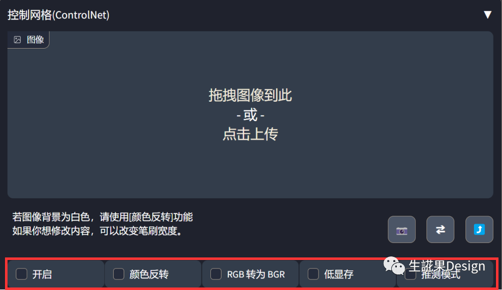 颜色反转:交换黑色和白色。例如,它可以在您上传涂鸦时使用。ControlNet 需要黑色背景和白色涂鸦。如果您使用白色背景的外部软件创建涂鸦,则必须使用此选项。如果您使用 ControlNet 的界面创建涂鸦,则不需要使用此选项。