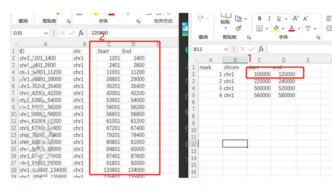 下图1左边是SNP的上下游区间,右边图2是基因的上下游区间,想以图1为标准,将区间内有基因的行放到右边。