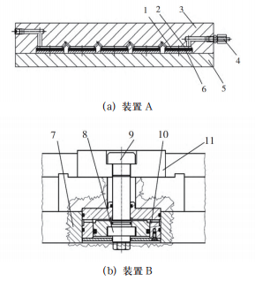 (1)液压夹紧装置 A(图 2a),是一种直线运动快速夹紧装置,其主要原理是通过机床直线运动液压夹紧装置对各移动轴进行液压锁紧,增加移动轴在钻削时的刚性。这种液压夹紧装置直接安装在移动部件的镶条和压板内,结构紧凑简单。在结构设计上不受过多限制,具有节省空间、夹紧力大、夹紧可靠、松开方便、使用寿命长等特点。总夹紧力大小可以通过设置液压系统压力或增减夹紧活塞数量设定。液压夹紧装置 A中的夹紧活塞与活塞腔设计在运动部件导轨压板内,液压油通过进油口进入活塞腔,推动夹紧活塞产生微量位移,与导轨之间产生摩擦力,实现运动部件的夹紧。夹紧活塞结构是由压块和橡胶活塞圈组成,其中压块的材质选用铜合金,并采用热处理工艺提升金属性能,保证压块既耐磨又具有足够的刚度,活塞橡胶圈的材质选用丁晴橡胶,可保证活塞腔的密封性,没有泄漏。
